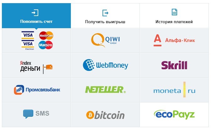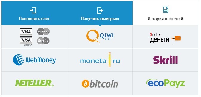 Минимальная сумма на вывод – RUB 500. Верхние лимиты зависят от платежного метода. Банковские карты, Биткоин, WebMoney, EcoPayz, Skrill – до RUB 75 000. Qiwi, Moneta.Ru, Яндекс.Деньги – до RUB 15 000.
